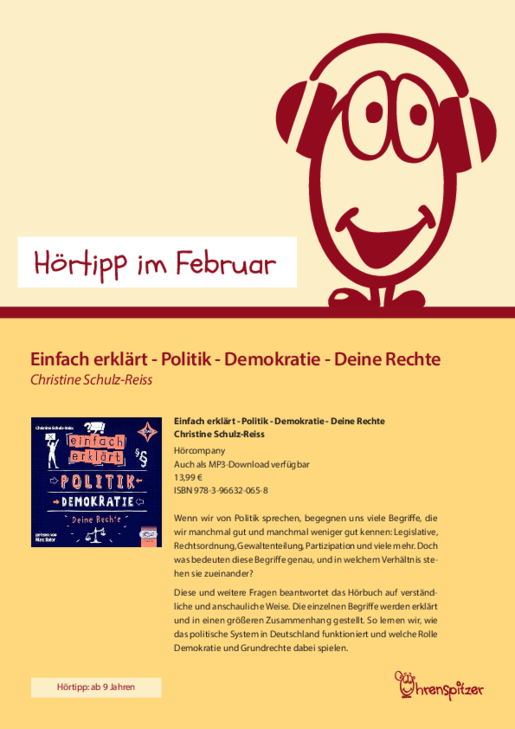 Diese und weitere Fragen beantwortet das Hörbuch auf verständliche und anschauliche Weise. Die einzelnen Begriffe werden erklärt und in einen größeren Zusammenhang gestellt. So lernen wir, wie das politische System in Deutschland funktioniert und welche Rolle Demokratie und Grundrechte dabei spielen. (schatz)