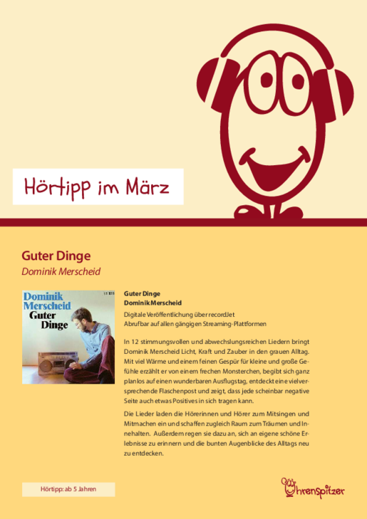 Die Nachricht seiner Lieder ist eindeutig. „Komm, lass uns rausgeh’n und das Leben genießen!“, singt Dominik Merscheid schon im ersten Lied der CD und zeigt in zehn weiteren Liedern allerlei Dinge auf, mit denen man sich gut die Zeit vertreiben und das Leben auch wirklich genießen kann. Ob bei einem Flohmarktbesuch, beim Ausdenken fantastischer Spiele im Wald, beim Besuch von Freundinnen und Freunden oder auch einfach mal zuhause – die Möglichkeiten sind schier unendlich. Natürlich gibt es auch so manche Tage, an denen man eher träge ist und nichts mit sich anzufangen weiß. Doch vielleicht helfen da die vielen Tipps, die Dominik Merscheid liebevoll in seinem Song „Laaangweilig“ eingebaut hat. Und falls nicht, hat man zumindest eine CD lang Zeit, um sich von seiner Langeweile abzulenken und sich auf die Suche nach einem neuen Lieblingslied zu machen. (schatz)