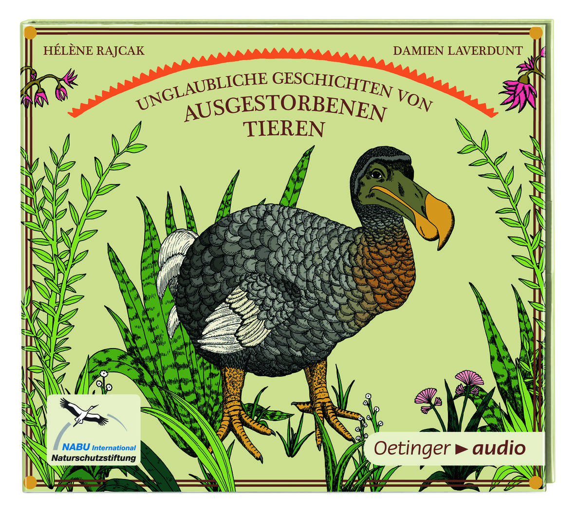 Dieses höchst informative und spannende Hörbuch ist ein großes Plädoyer für den Artenschutz. Sterben doch unaufhaltsam weitere Tierarten aus, so werden hier längst ausgestorbene Tiere neu zum Leben erweckt. Wir erfahren in 52 Tracks von fantastisch anmutenden Tieren, die in Amerika, Afrika, Eurasien oder Ozeanien lebten. Wir hören vom Glyptodon, vom Königskleidervogel, vom Riesenalk, vom Karolinasittich, vom Elefantenvogel, vom Tretretretre, vom Dodo, vom Wollhaarmammut, vom Bali-Tiger, vom Beutelwolf und vielen weiteren Wesen. Jedes Tier erhält dabei ein bis zwei Minuten, in denen wir von dessen Leben, Eigenart und vom Aussterben erfahren, das oft mit dem Handeln der Menschen zusammenhing und zusammenhängt. So bringt Oetinger Audio dieses Hörbuch in Kooperation mit NABU International heraus. Die CD wartet mit einem sehr schönen Booklet auf, das mit weiteren Informationen gespickt ist. Vom Verkauf einer CD sollen 50 Cent direkt an den Artenschutz gehen. Der Inhalt des Hörbuchs basiert auf dem gleichnamigen Buch der Autoren Hélène Rajcak und Damien Laverdunt und wurde hier in gekürzter Form zum Hören aufbereitet. Als Sprecher sind Sebastian Blomberg, Gabriele Blum, Konstantin Graudus, Ursula Illert, Robert Missler, Anne Moll, Erik Schäffler, Leon Seibel, Jens Wawrczeck und Santiago Ziesmer zu hören. Ein wundervolles Sammelsurium an vergessenen Tieren und ihren Geschichten. Ein Hörbuch das Tiere retten soll und das vor allem für Sensibilität gegenüber der Tierwelt sorgt. Denn die kurzen Episoden zeigen uns welche Schätze uns fortwährend verloren gehen und welchen Anteil der Mensch daran hat. (vo)